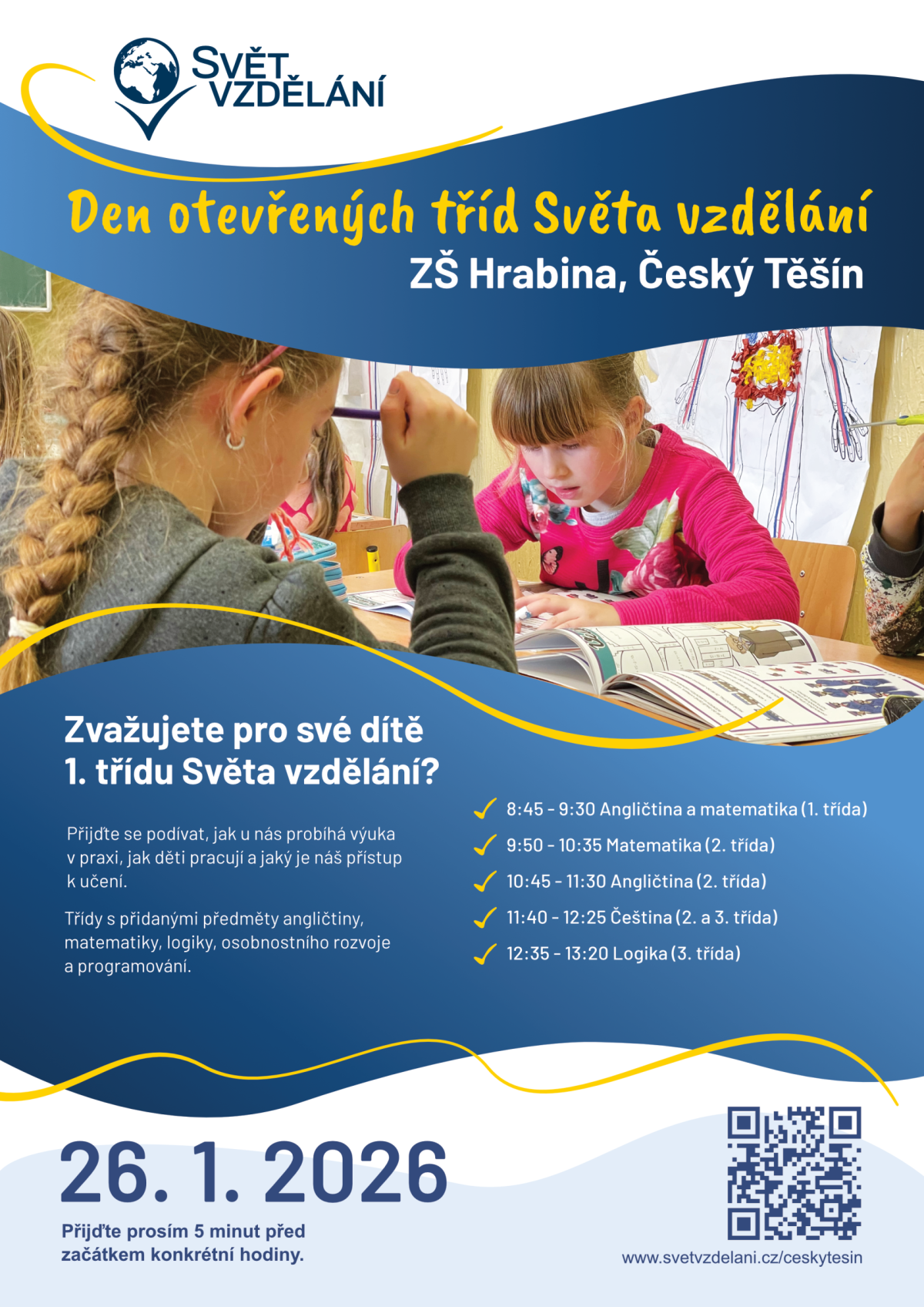 Přijdte se 26.1.2026 podívat, jak u nás probíhá výuka v praxi, jak děti pracují a jaký je náš přistup k učení.