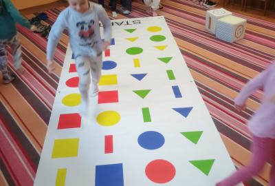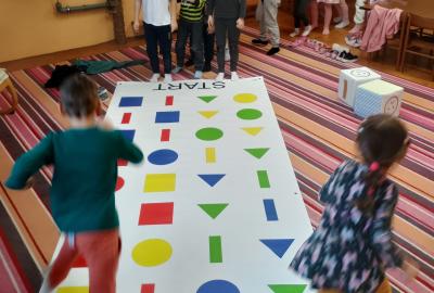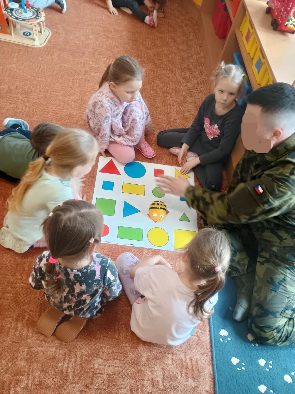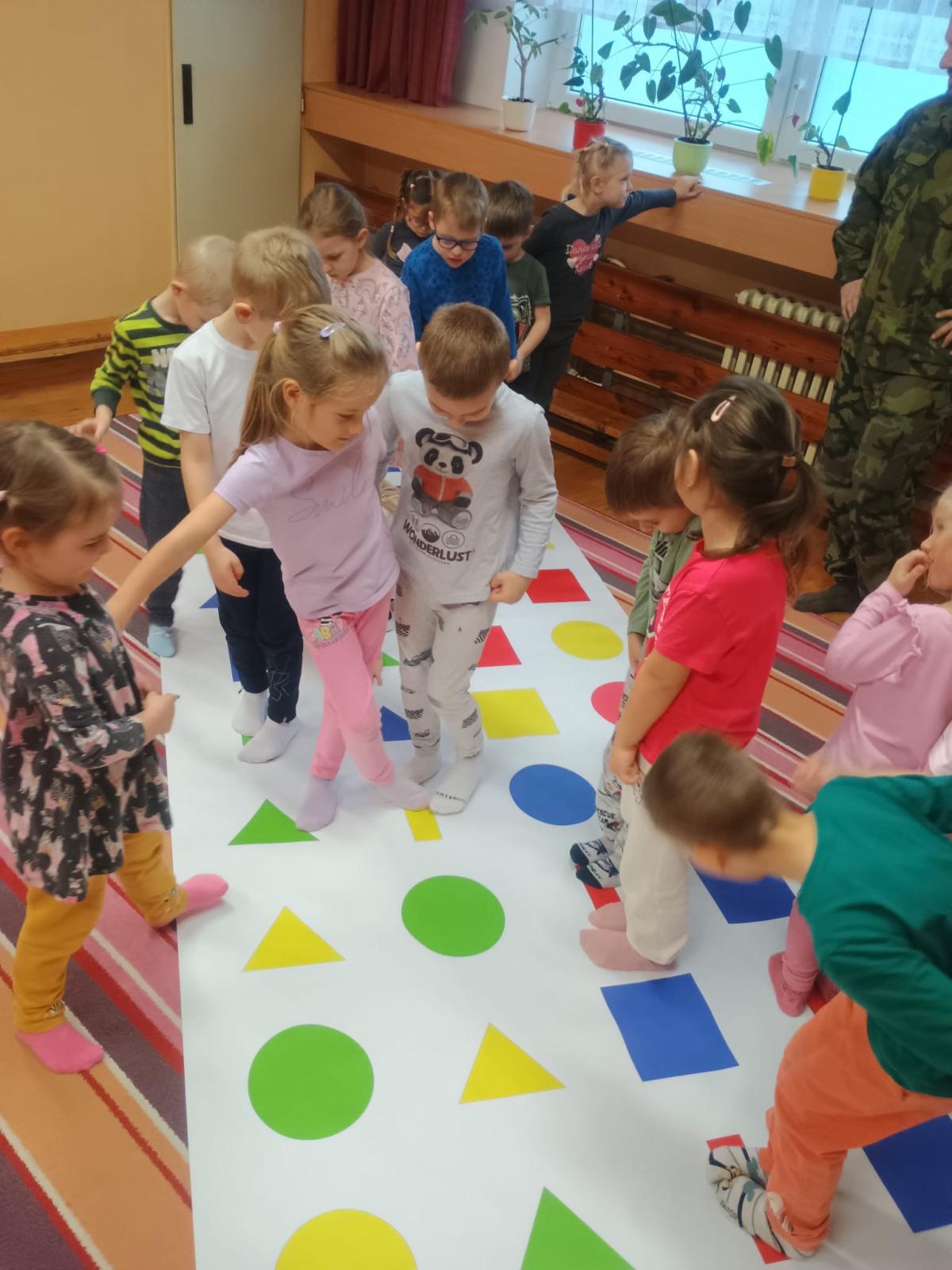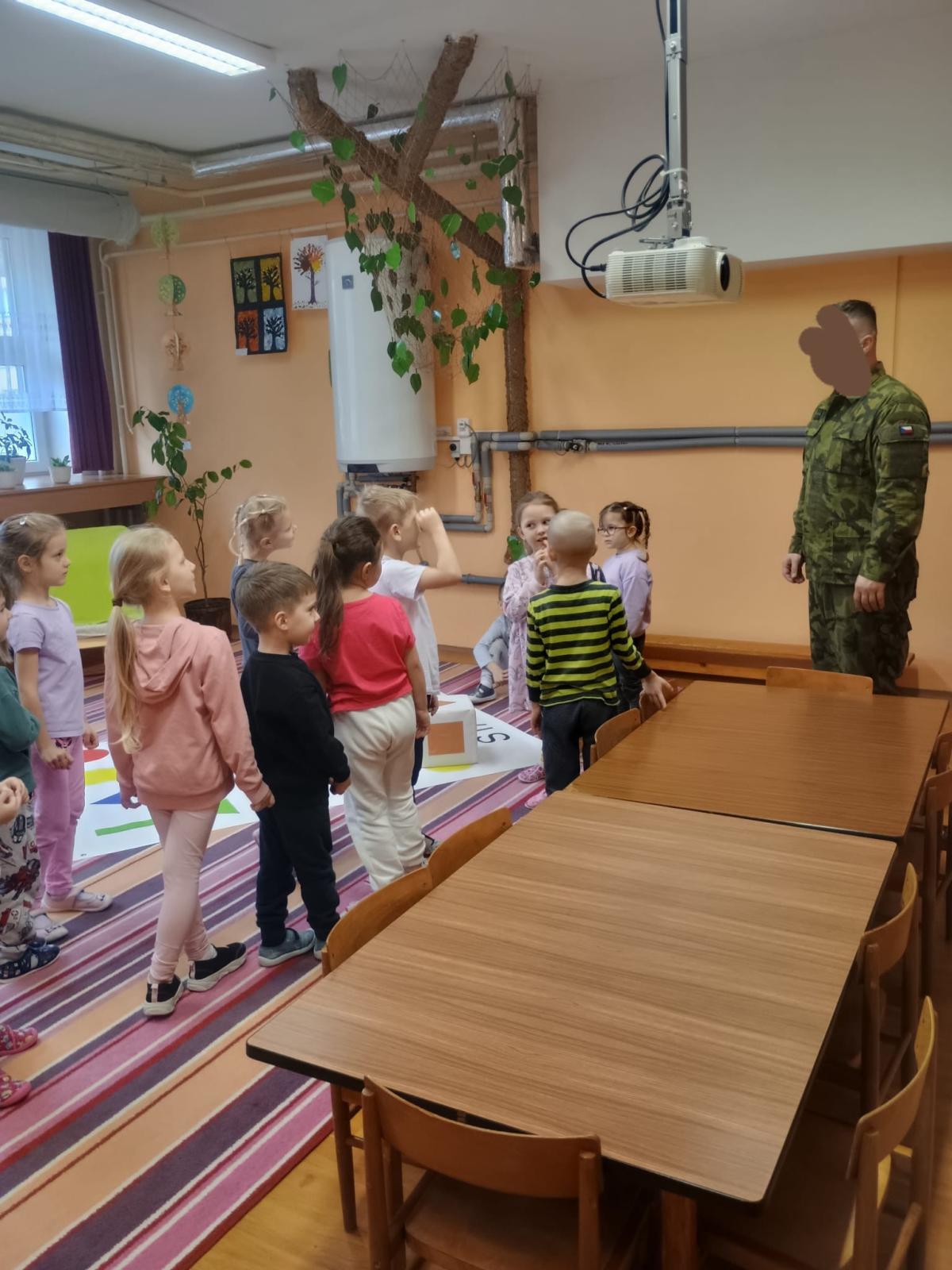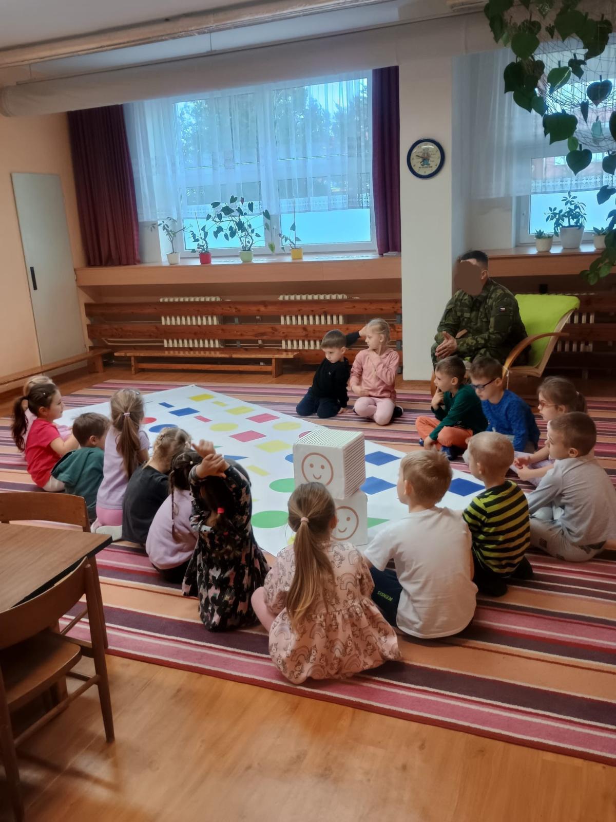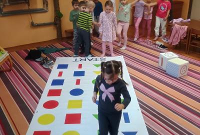 Děti předvedly jak se salutuje a hlásí nadřízenému-ztišit skupinu dětí, počet holek a kluků. Pohybové hry na geometrickém koberci s kostkami, rozlišovaly geometrické tvary s pravolevou orientací.