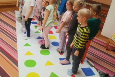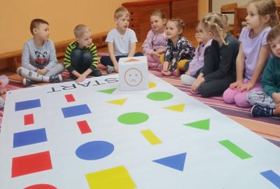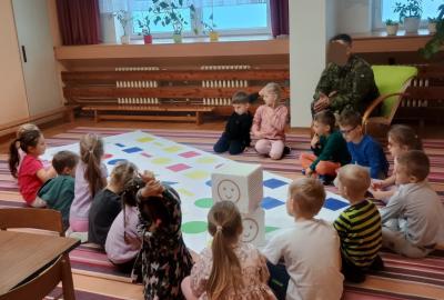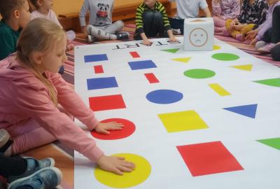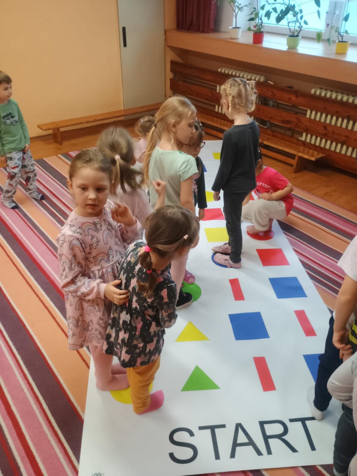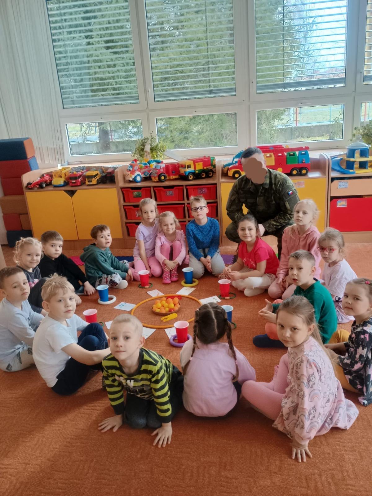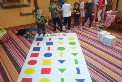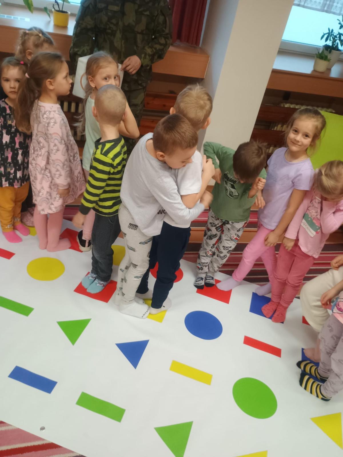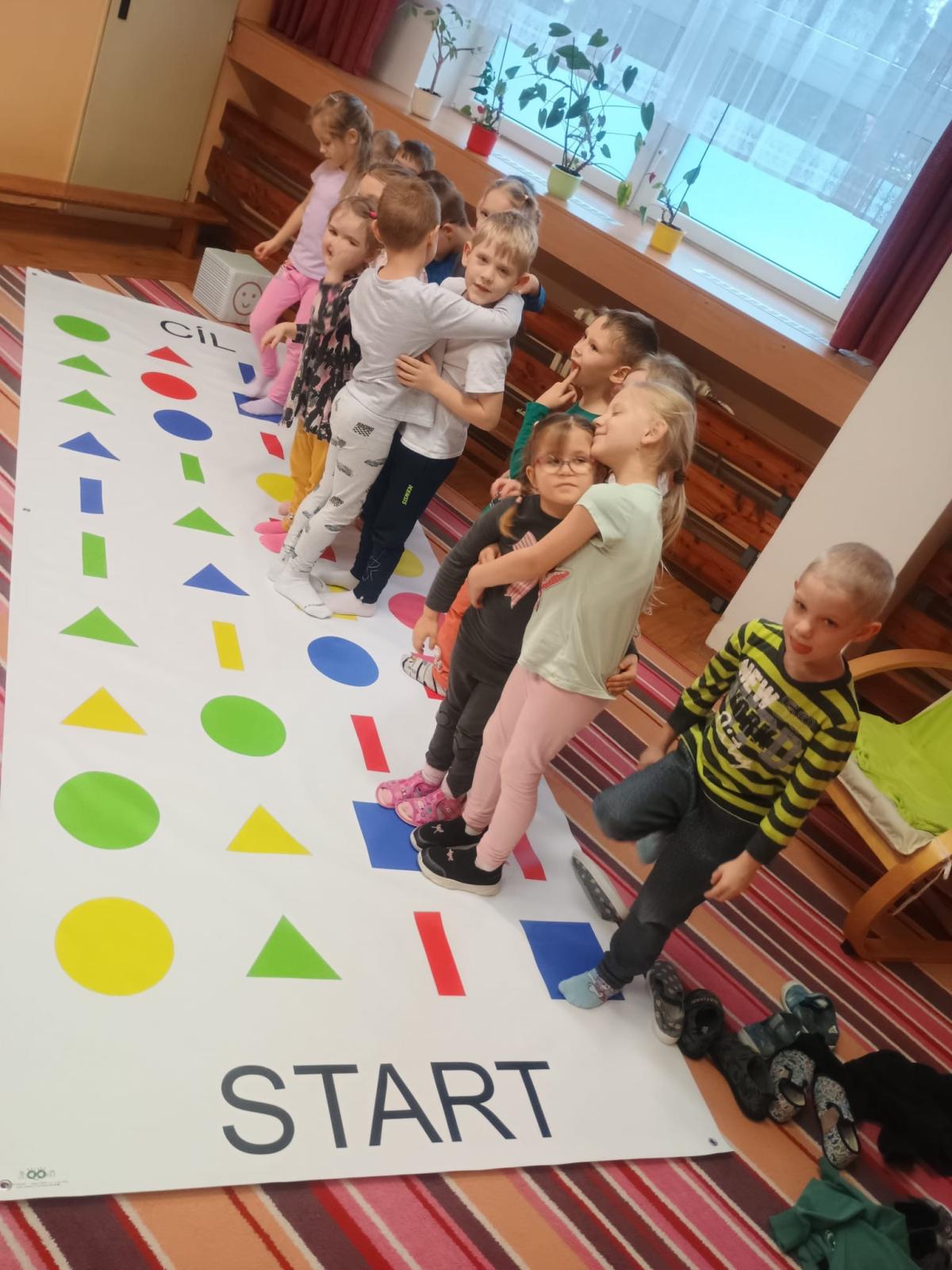 Děti předvedly jak se salutuje a hlásí nadřízenému-ztišit skupinu dětí, počet holek a kluků. Pohybové hry na geometrickém koberci s kostkami, rozlišovaly geometrické tvary s pravolevou orientací.