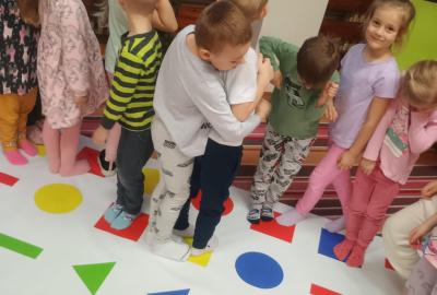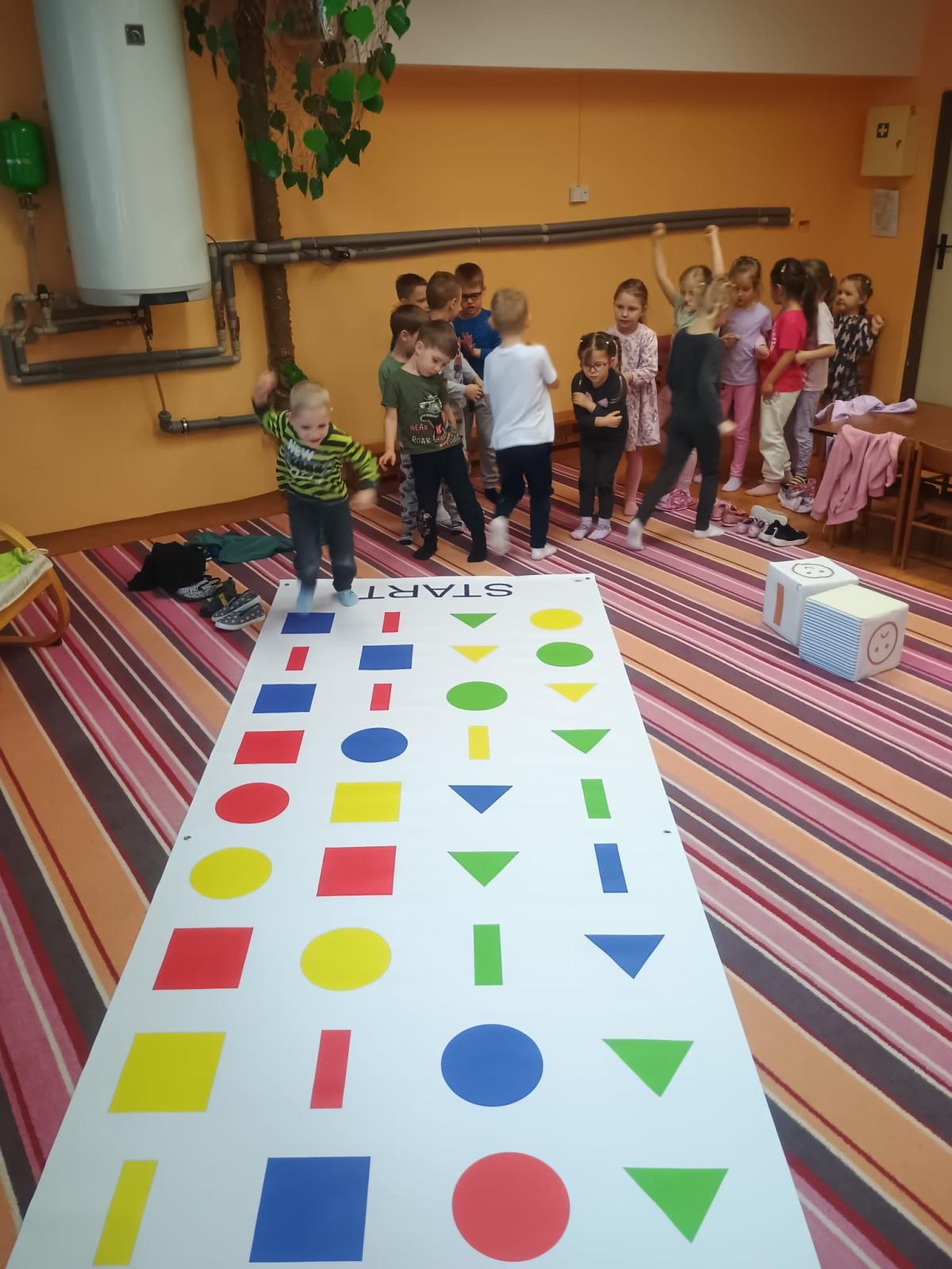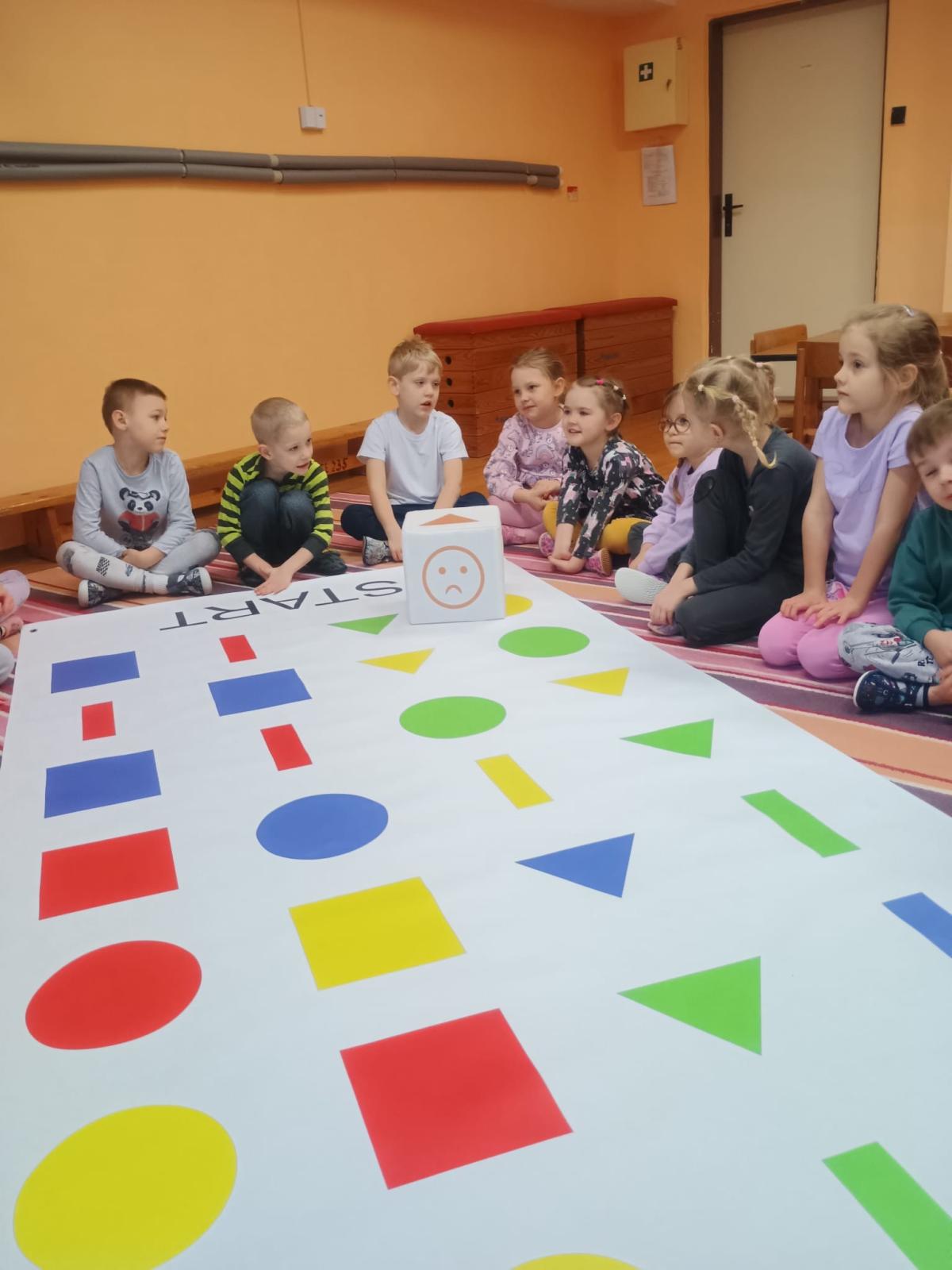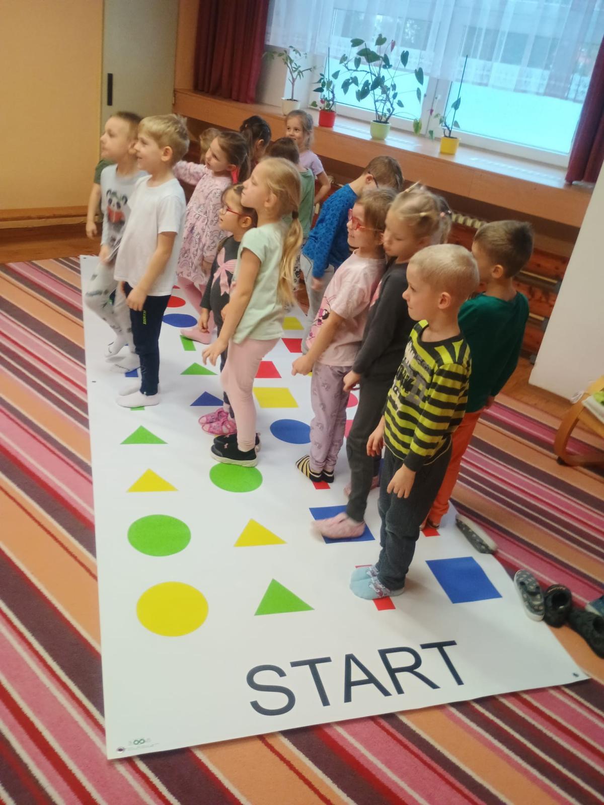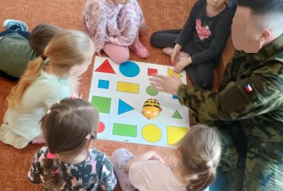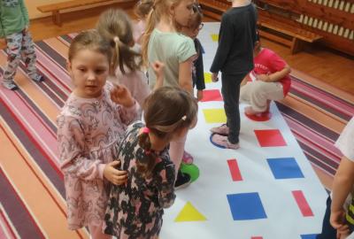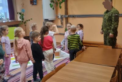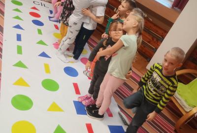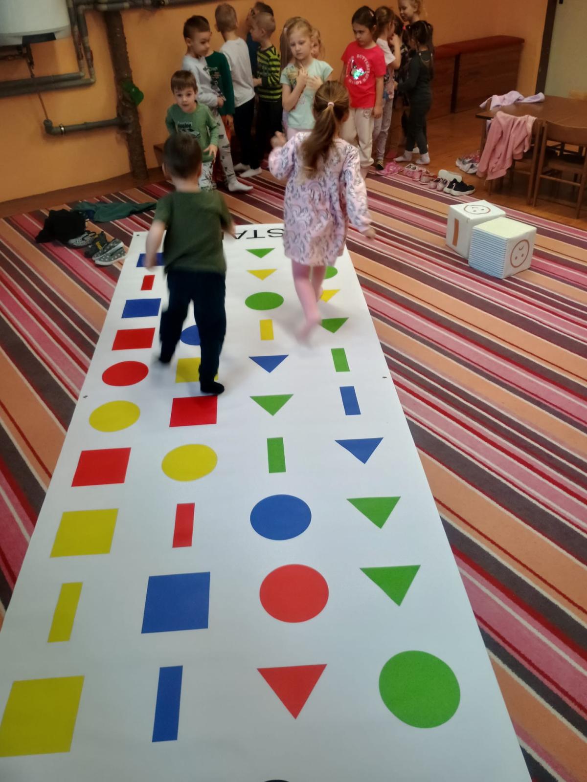 Děti předvedly jak se salutuje a hlásí nadřízenému-ztišit skupinu dětí, počet holek a kluků. Pohybové hry na geometrickém koberci s kostkami, rozlišovaly geometrické tvary s pravolevou orientací.