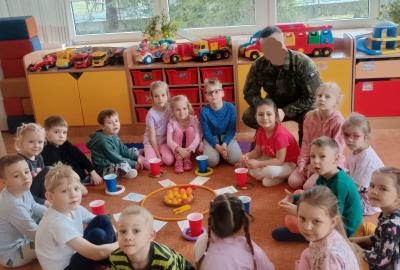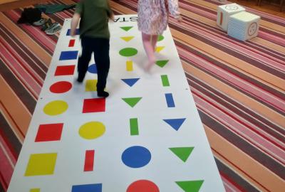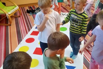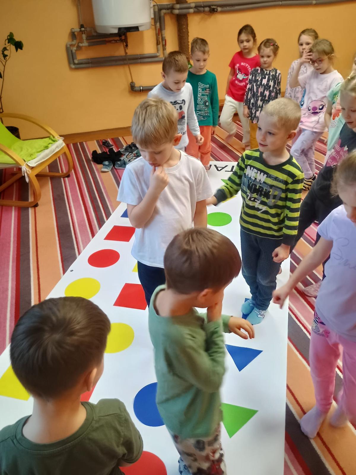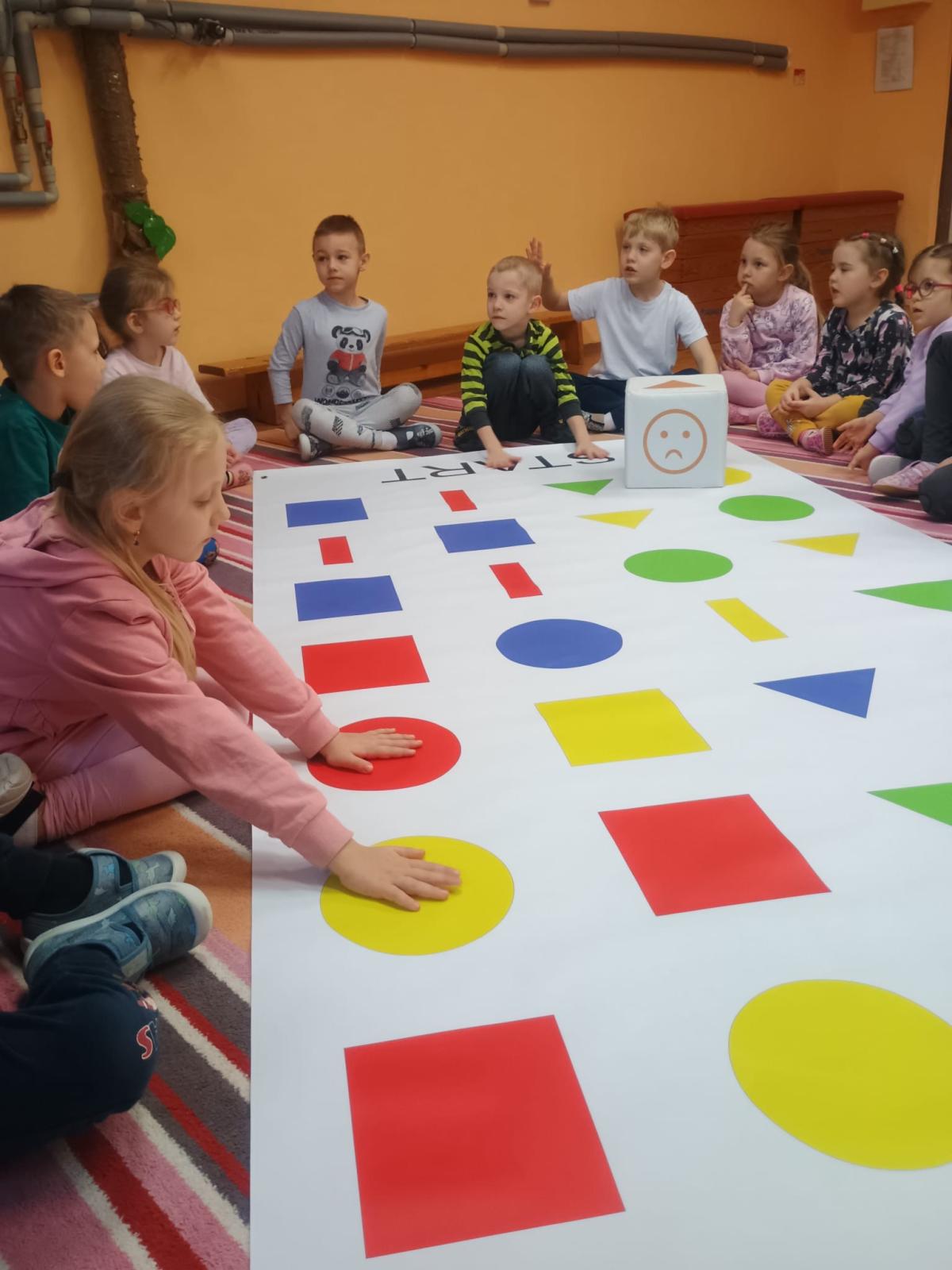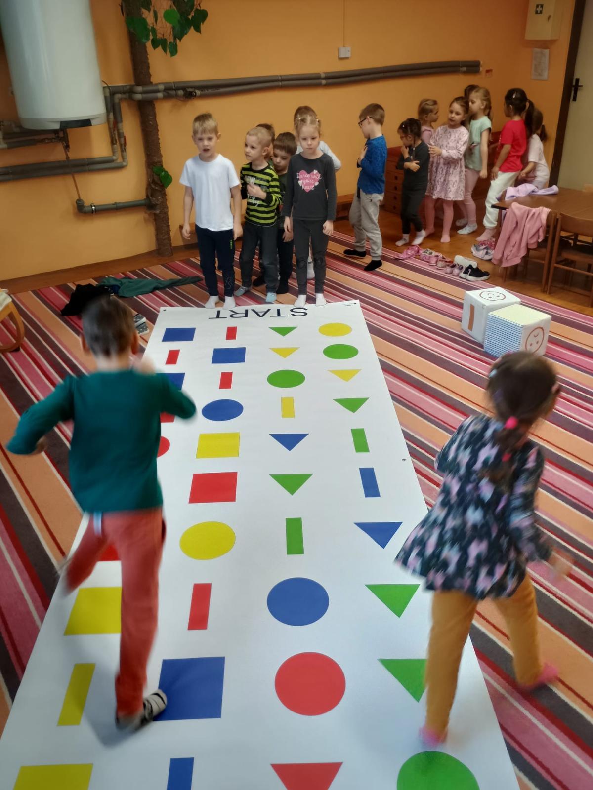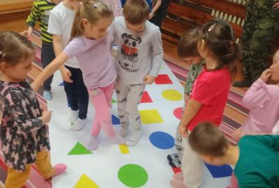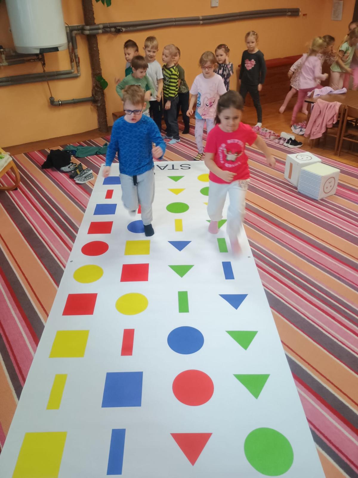 Děti předvedly jak se salutuje a hlásí nadřízenému-ztišit skupinu dětí, počet holek a kluků. Pohybové hry na geometrickém koberci s kostkami, rozlišovaly geometrické tvary s pravolevou orientací.