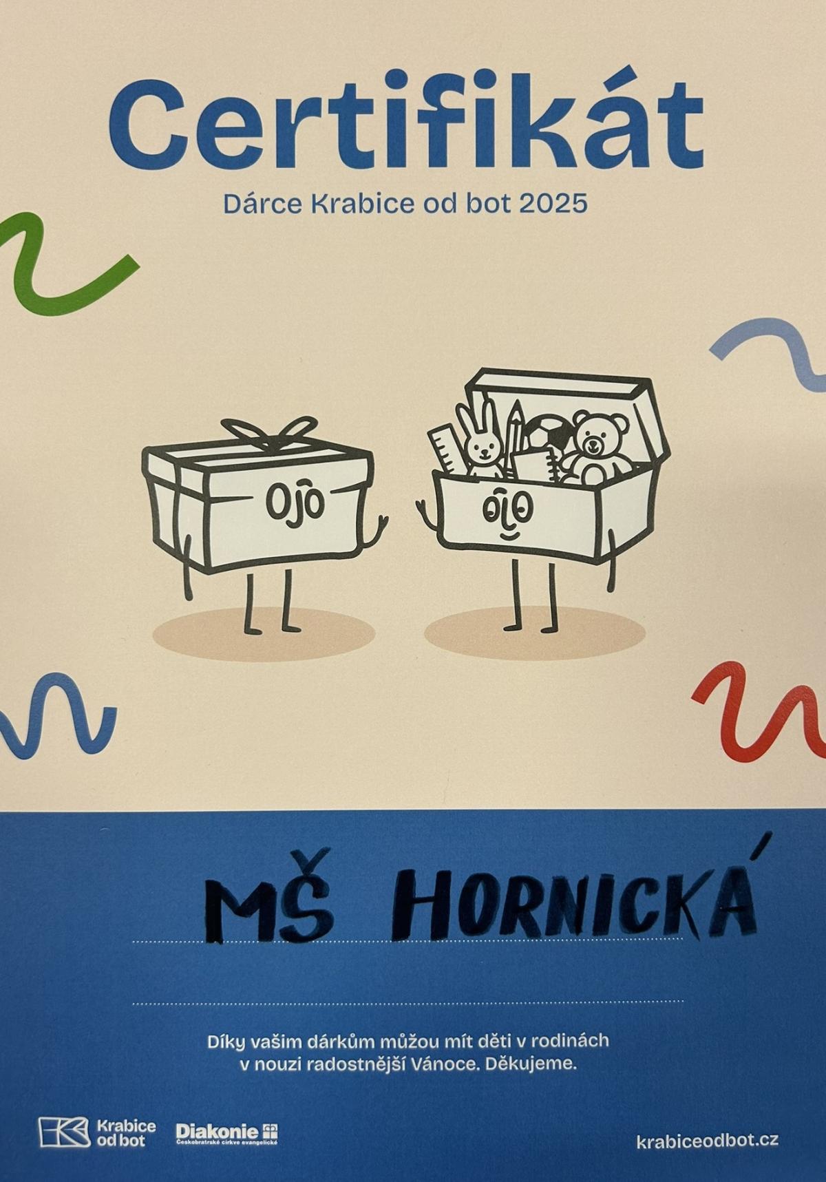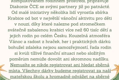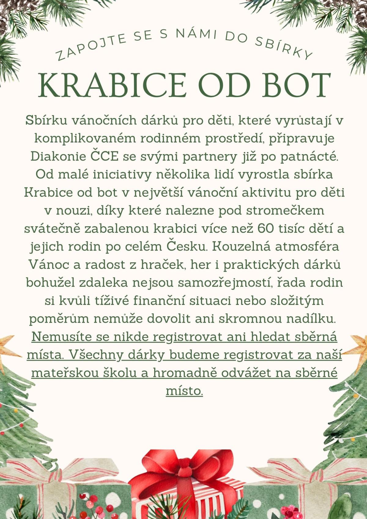 Děkujeme všem, kteří se s námi zapojili do letošní sbírky KRABICE OD BOT. Tato sbírka přináší naději tam, kde chybí, a připomíná, že i drobný dárek od srdce může dát dětem pocit, že na ně někdo myslí a že jsou důležité. Vánoce jsou o sdílení – a tato sbírka je způsob, jak otevřít srdce těm, kdo to nejvíc potřebují.