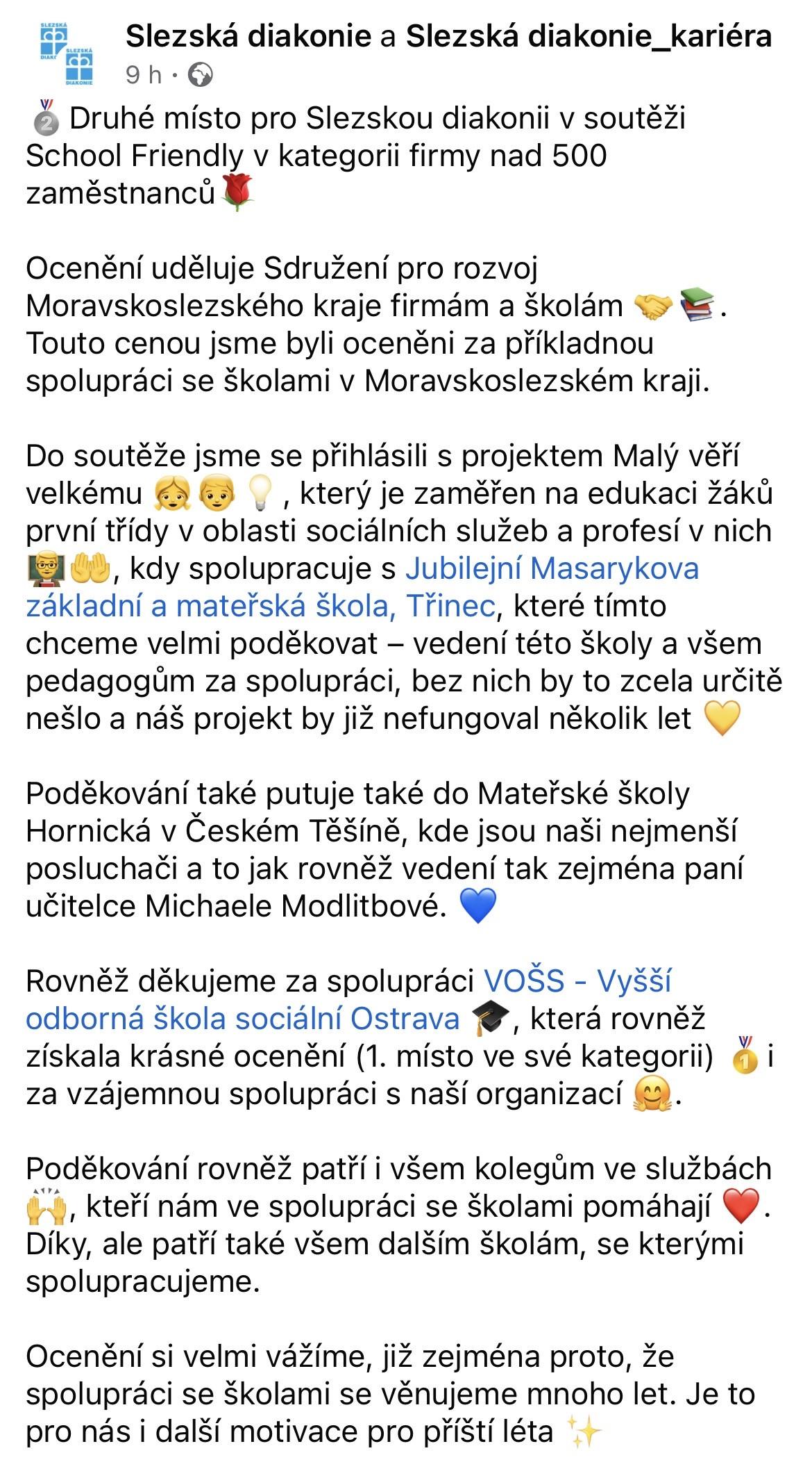 Velká gratulace míří do Slezské Diakonie k druhému místu v soutěži "School friendly".