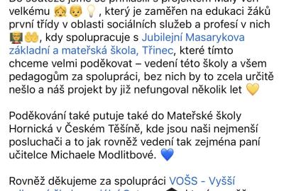 Zároveň bychom chtěly mnohokrát poděkovat a ocenit, že se může naše školka již 4. rokem účastnit vašeho projektu Malý věří velkému, který dětem pomáhá seznamovat se a vzdělávat je v oblasti sociálních služeb. Děkujeme, že ke své práci přistupujete s otevřeným a laskavým srdcem a že zrovna naše školka může být její součástí.