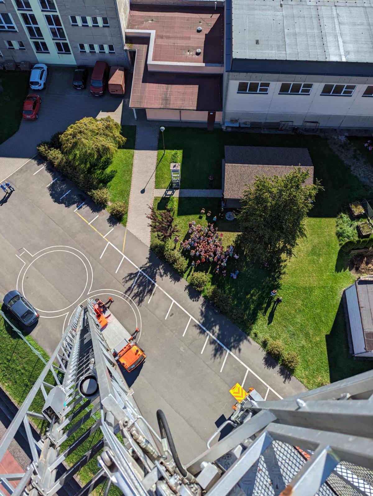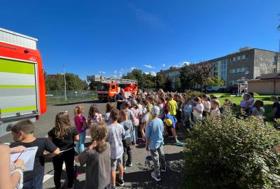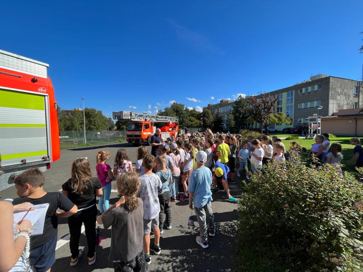 Děti netrpělivě čekaly, až hasiči dorazí. Ve 13:30 hodin vjela hasičská auta na parkoviště školy.