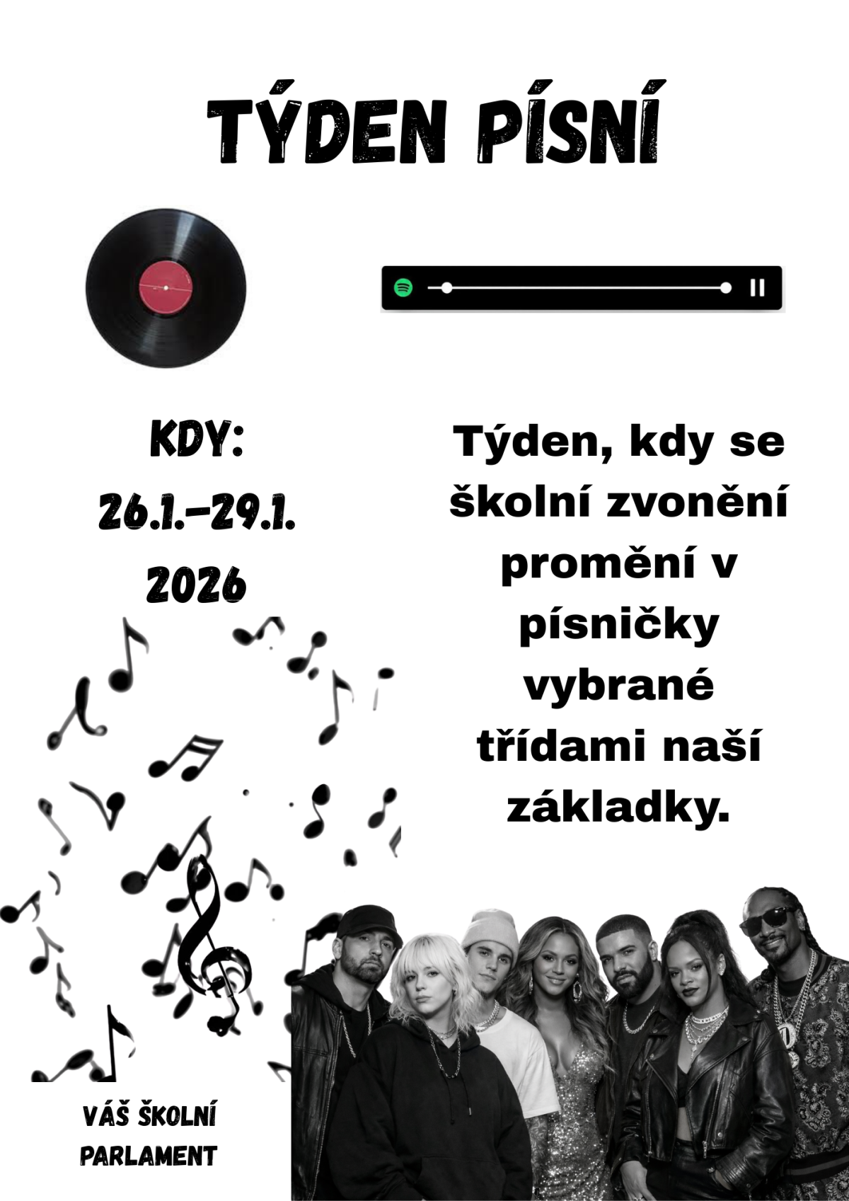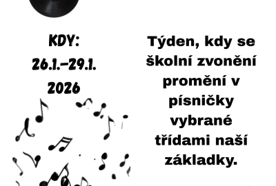 Příští týden nás na naší škole čeká oblíbená akce Týden písní. Zvonění před vyučovacími hodinami tentokrát nebude obyčejné – nahradí ho písně, které vybraly jednotlivé třídy naší ZŠ.