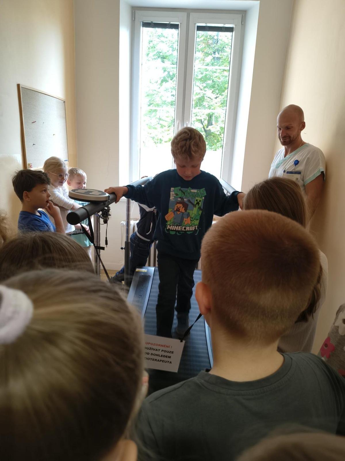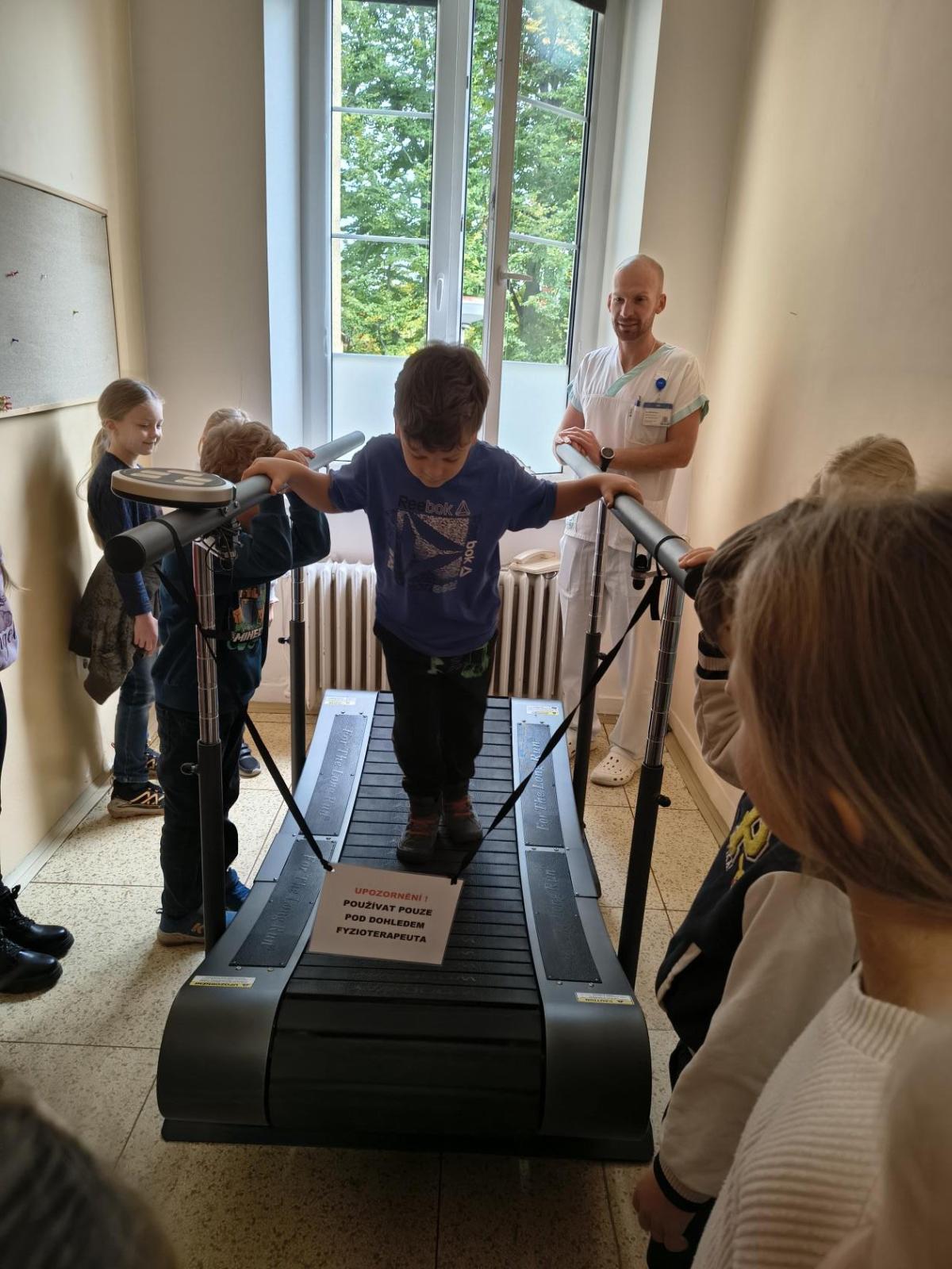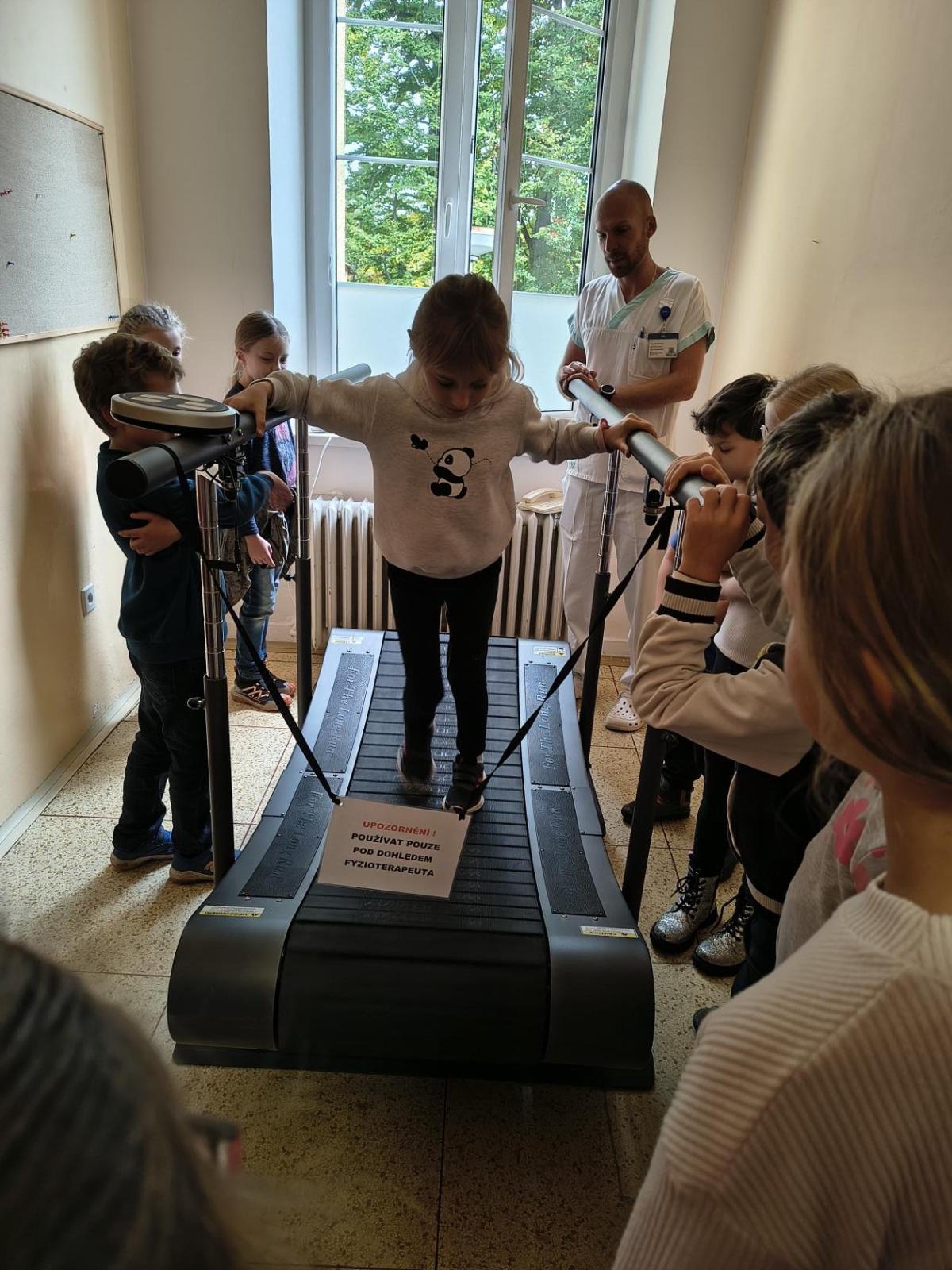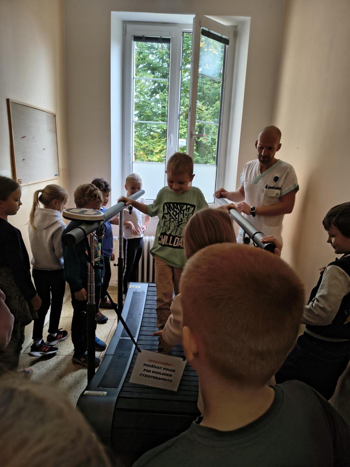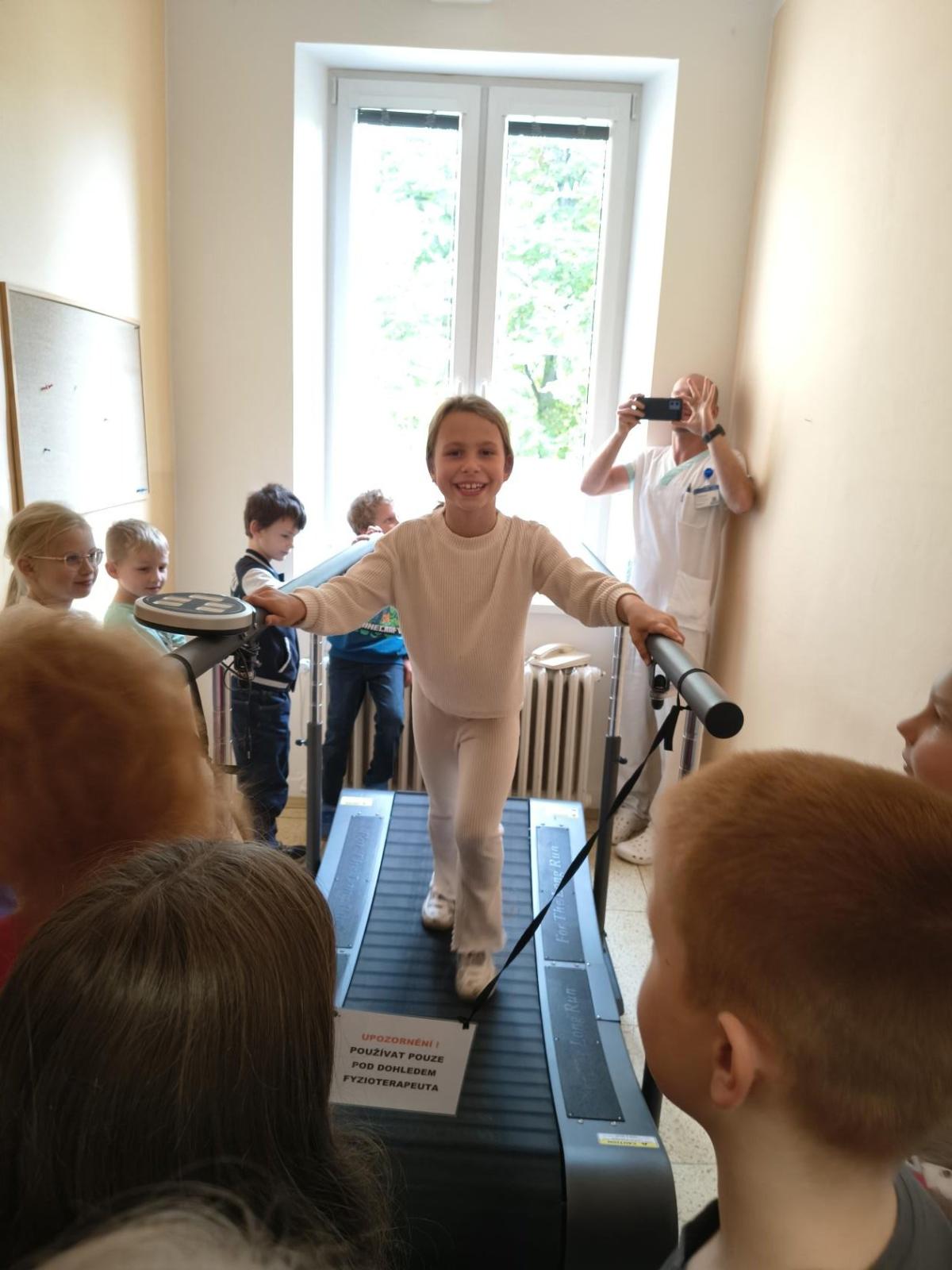 Navštívili jsme rehabilitační oddělení v nemocnici, kam nás pozval tatínek Emči. Bylo to pro nás velmi zajímavé. Viděli jsme, jak se léčí pacienti vodoléčbou, elektroléčbou nebo laserem nebo rázovou vlnou. Ti odvážní si to i vyzkoušeli. Co jsme si vyzkoušeli všichni, byl pás, po kterém jsme se učili správně chodit. No, někteří po něm spíš běhali, asi někam spěchali... :-)