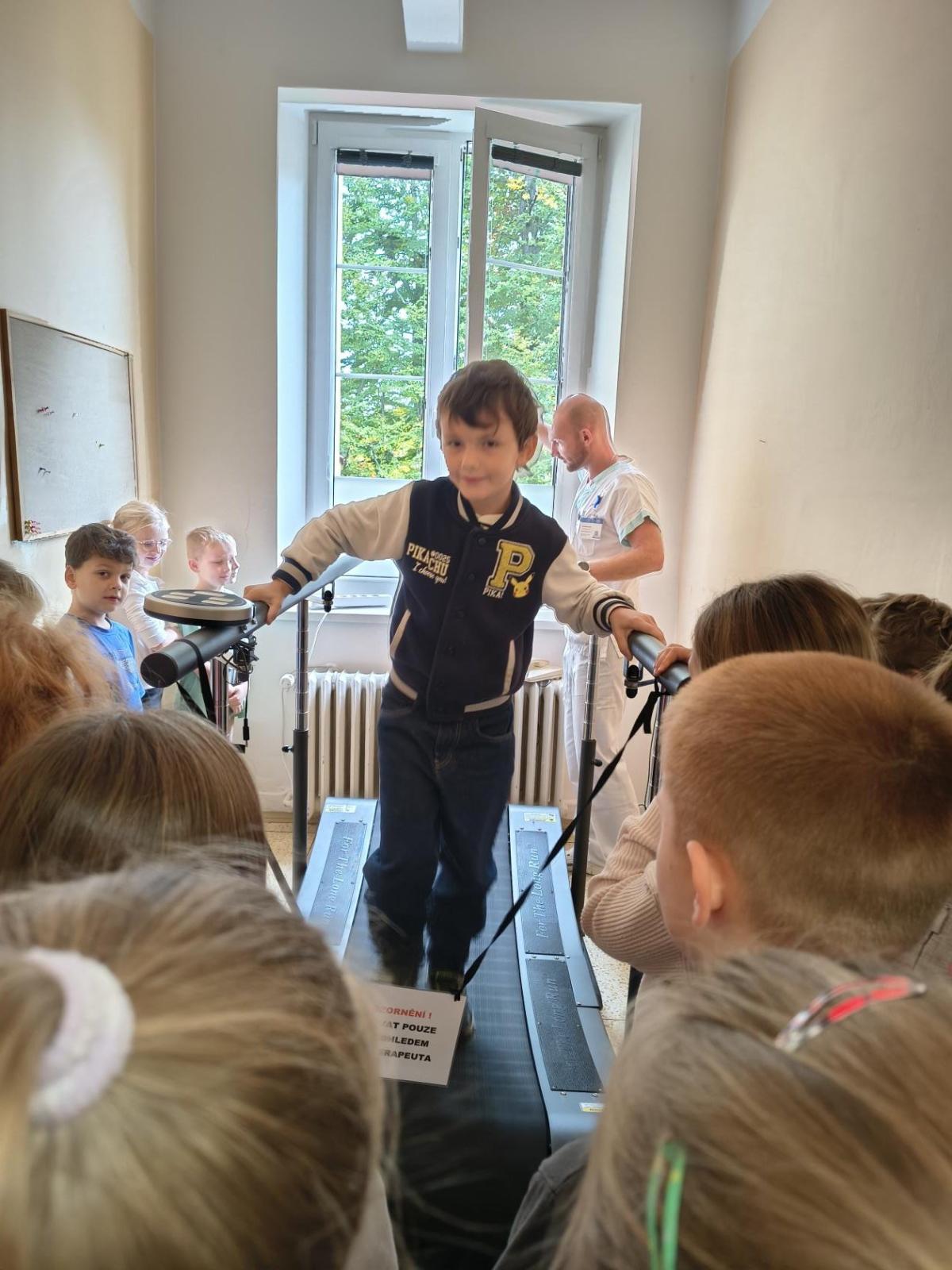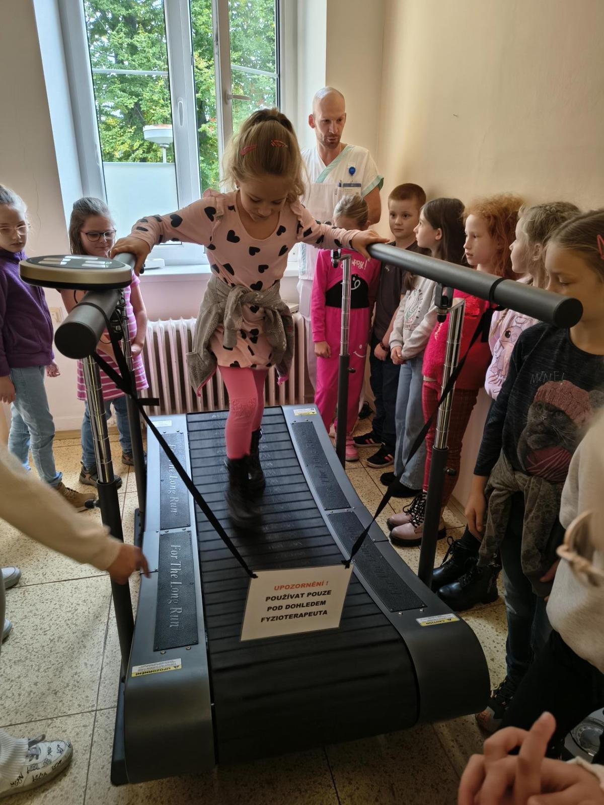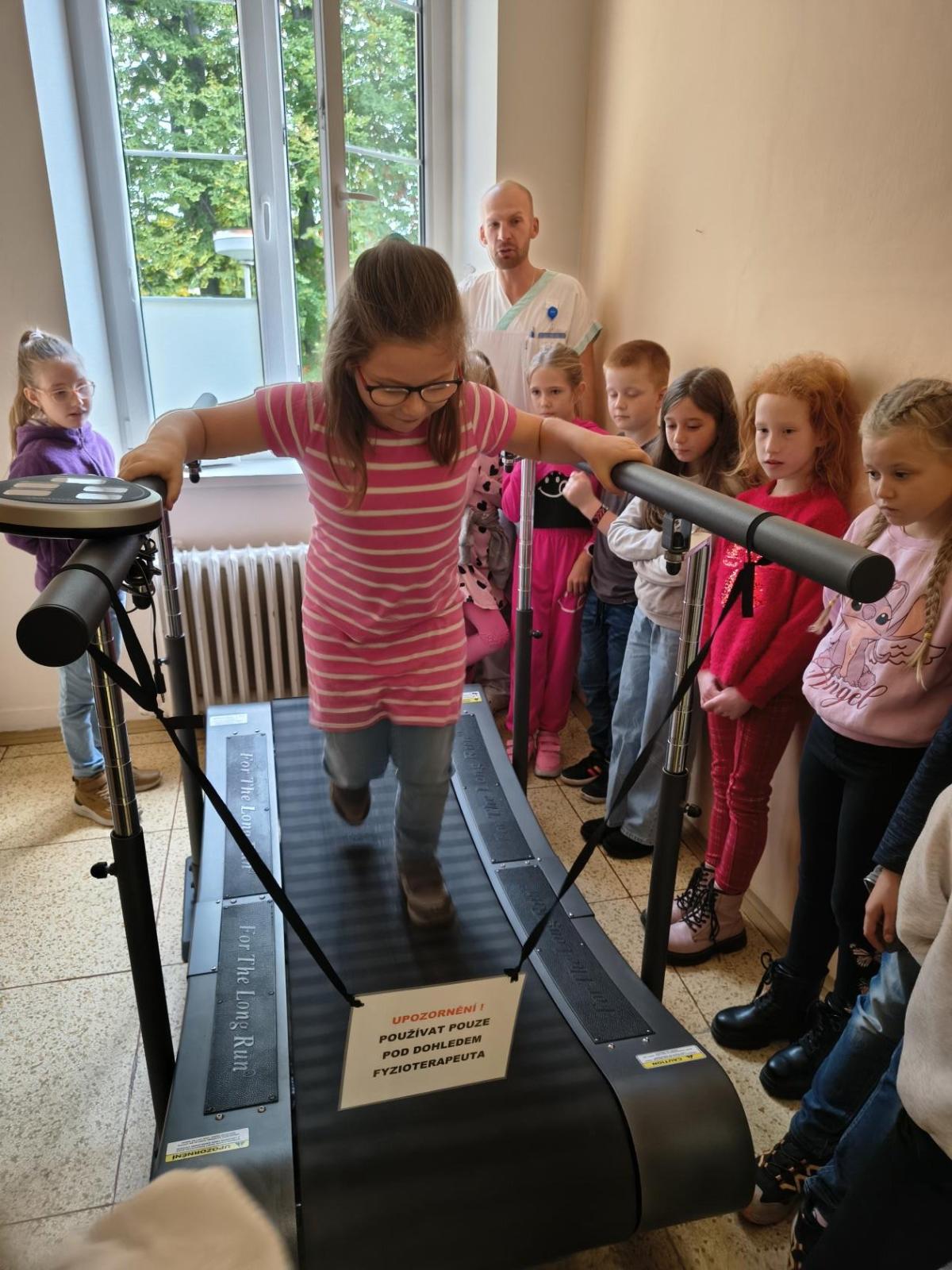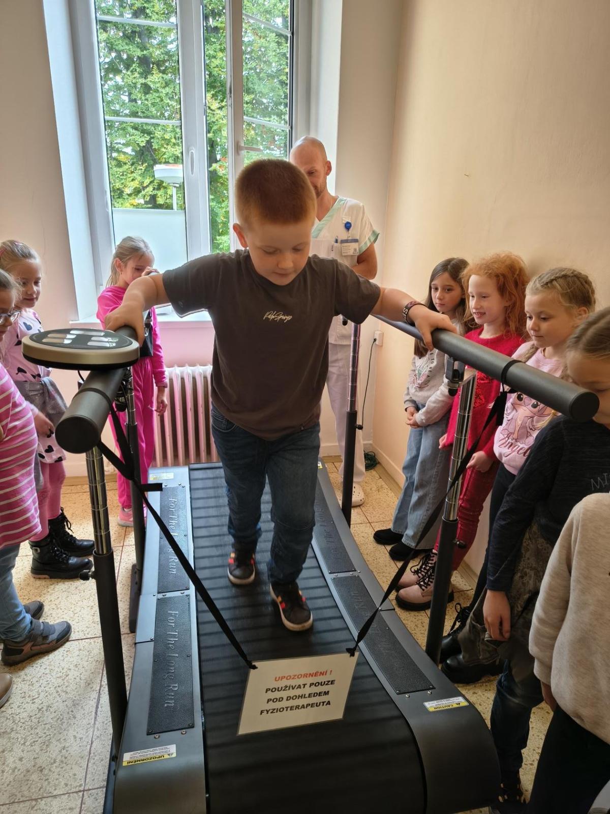 Navštívili jsme rehabilitační oddělení v nemocnici, kam nás pozval tatínek Emči. Bylo to pro nás velmi zajímavé. Viděli jsme, jak se léčí pacienti vodoléčbou, elektroléčbou nebo laserem nebo rázovou vlnou. Ti odvážní si to i vyzkoušeli. Co jsme si vyzkoušeli všichni, byl pás, po kterém jsme se učili správně chodit. No, někteří po něm spíš běhali, asi někam spěchali... :-)