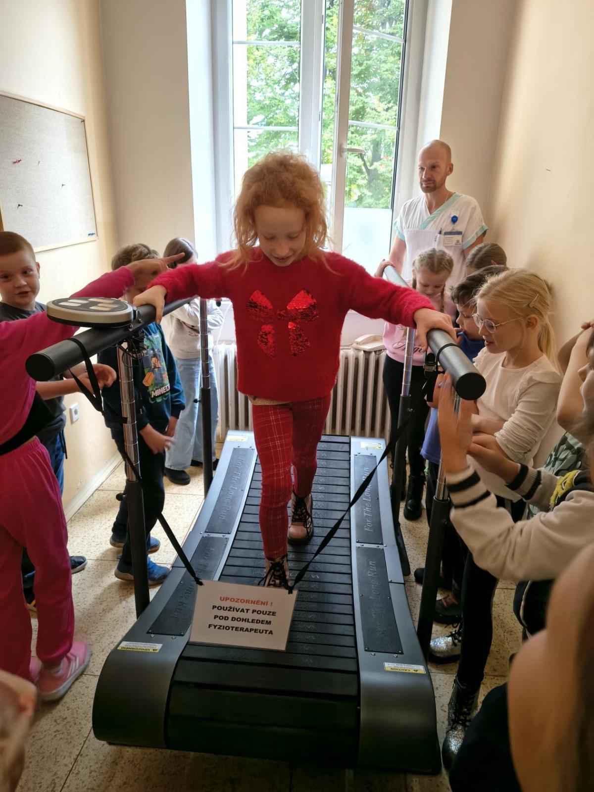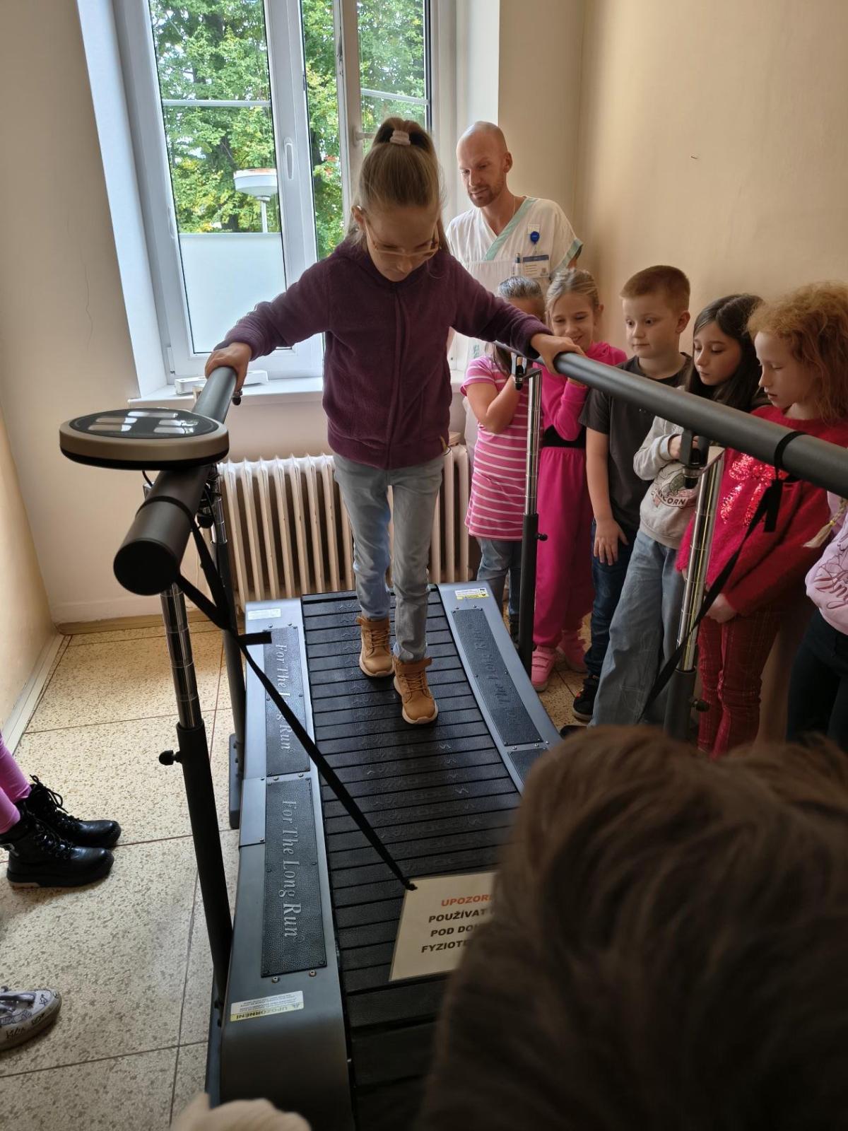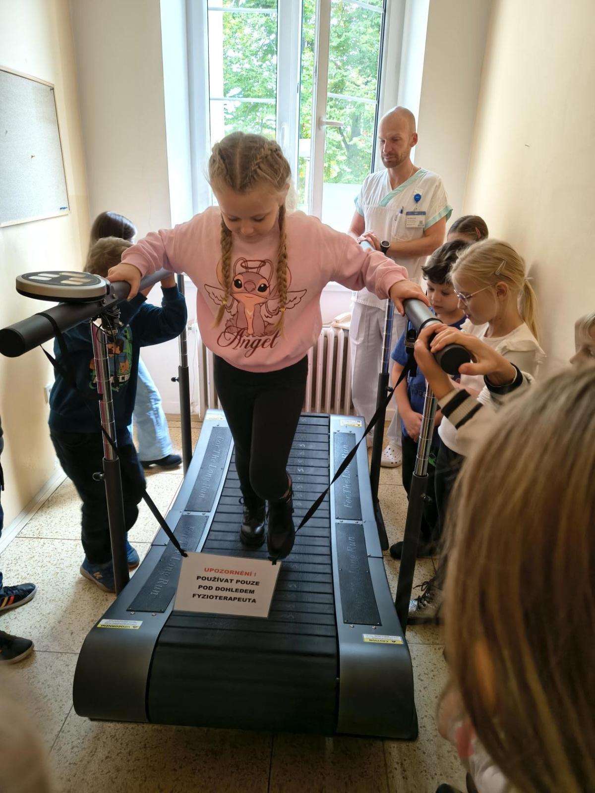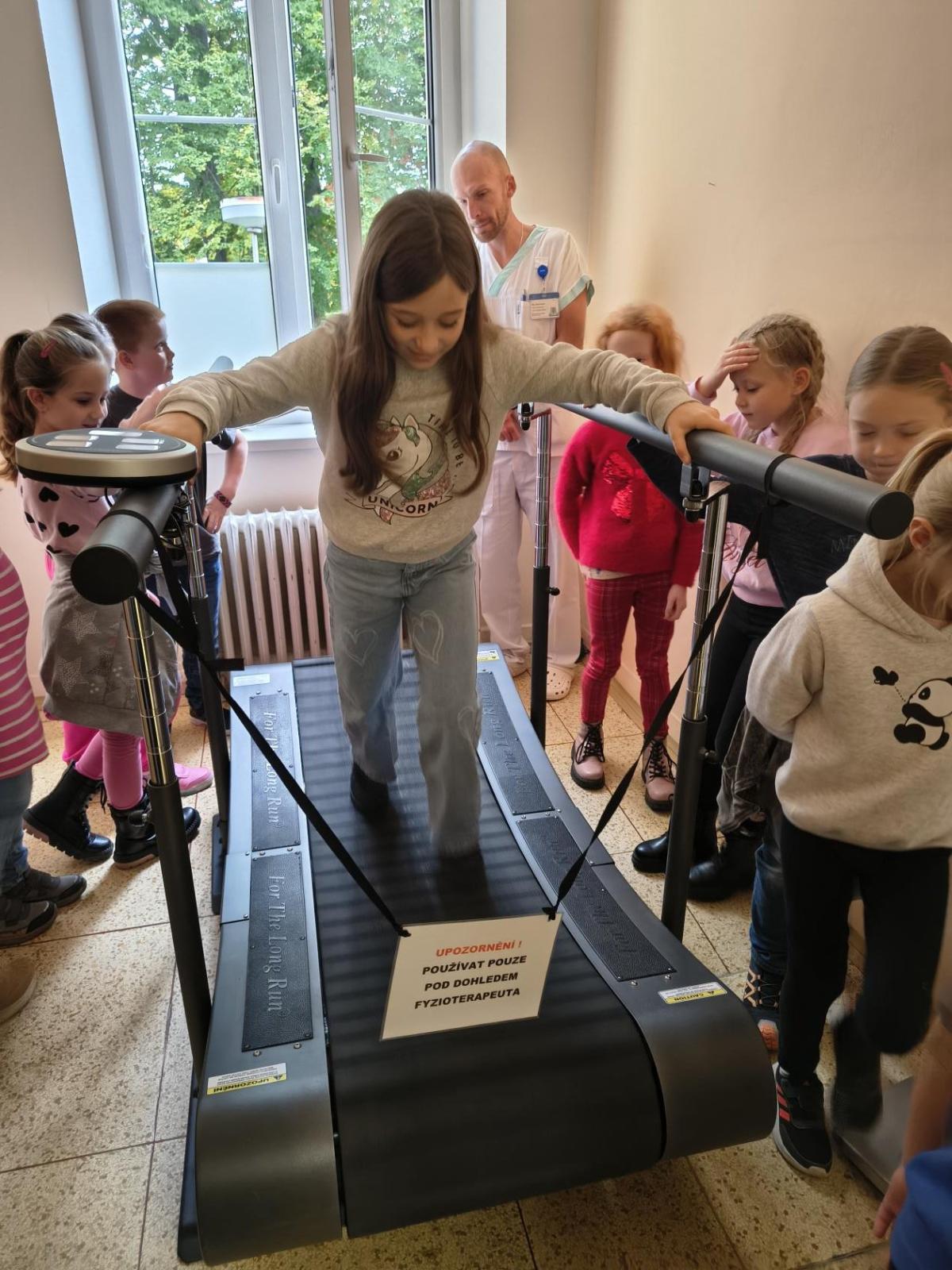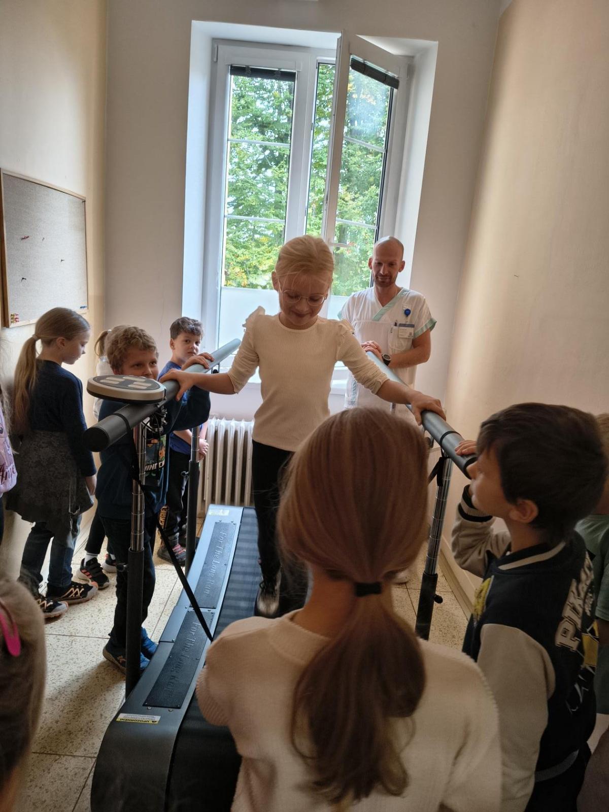 Navštívili jsme rehabilitační oddělení v nemocnici, kam nás pozval tatínek Emči. Bylo to pro nás velmi zajímavé. Viděli jsme, jak se léčí pacienti vodoléčbou, elektroléčbou nebo laserem nebo rázovou vlnou. Ti odvážní si to i vyzkoušeli. Co jsme si vyzkoušeli všichni, byl pás, po kterém jsme se učili správně chodit. No, někteří po něm spíš běhali, asi někam spěchali... :-)
