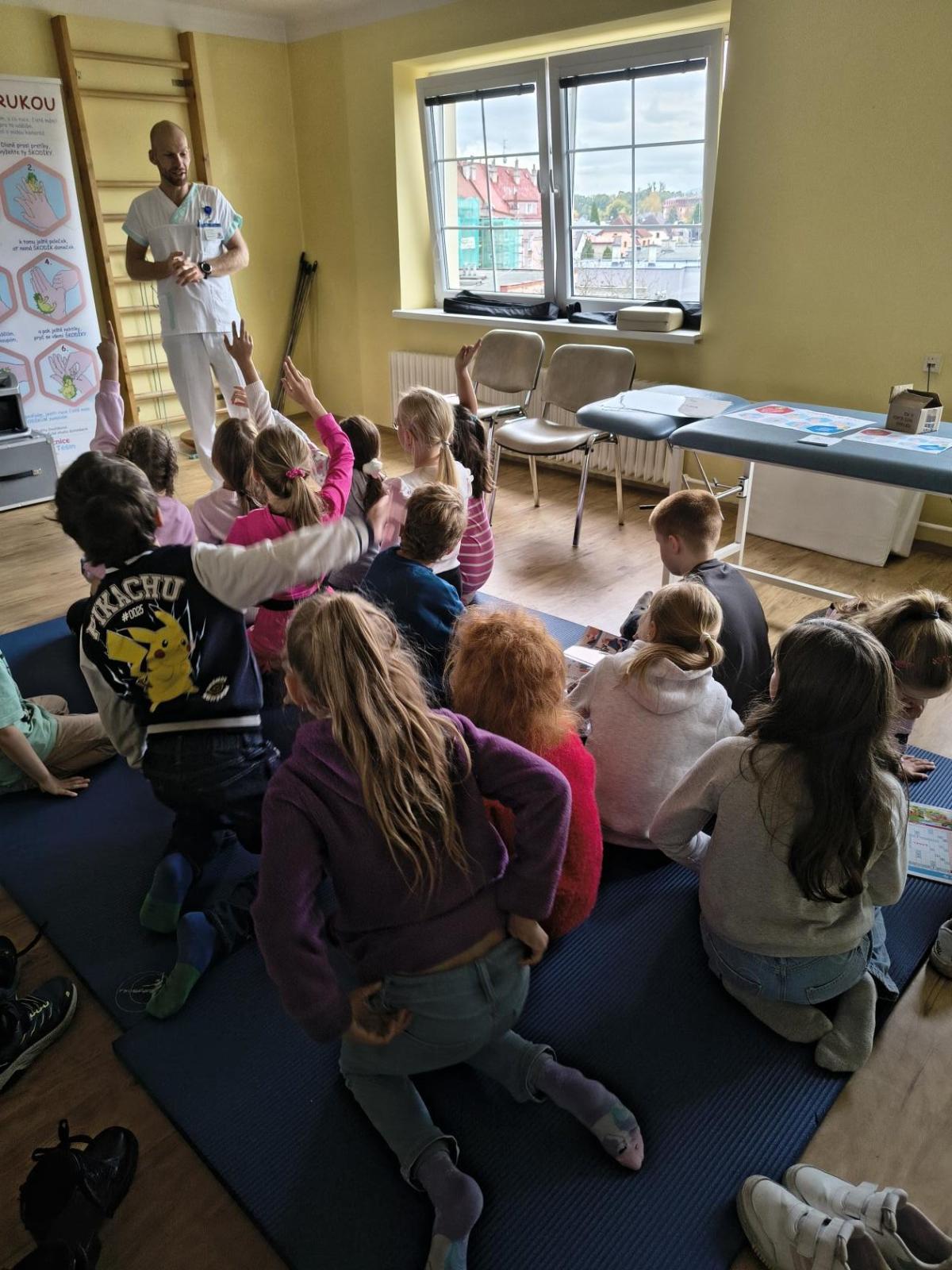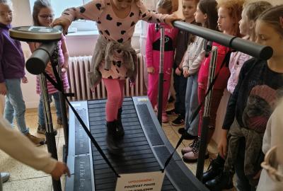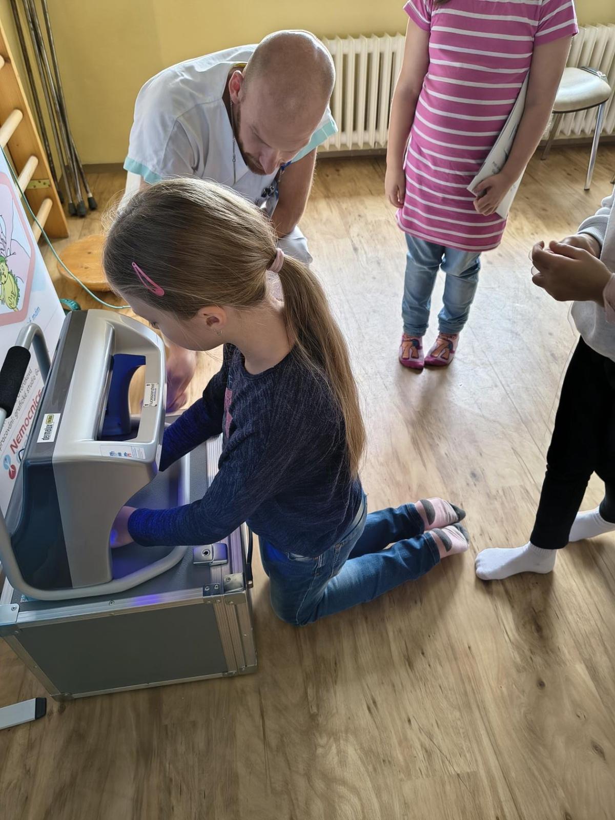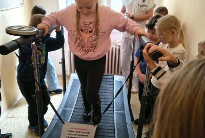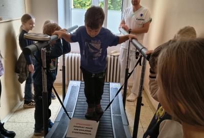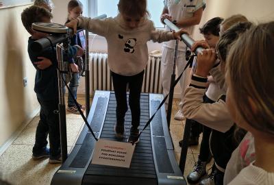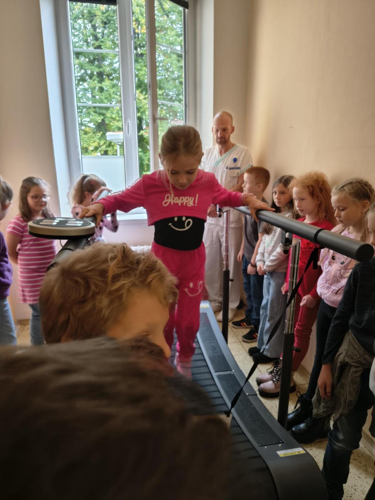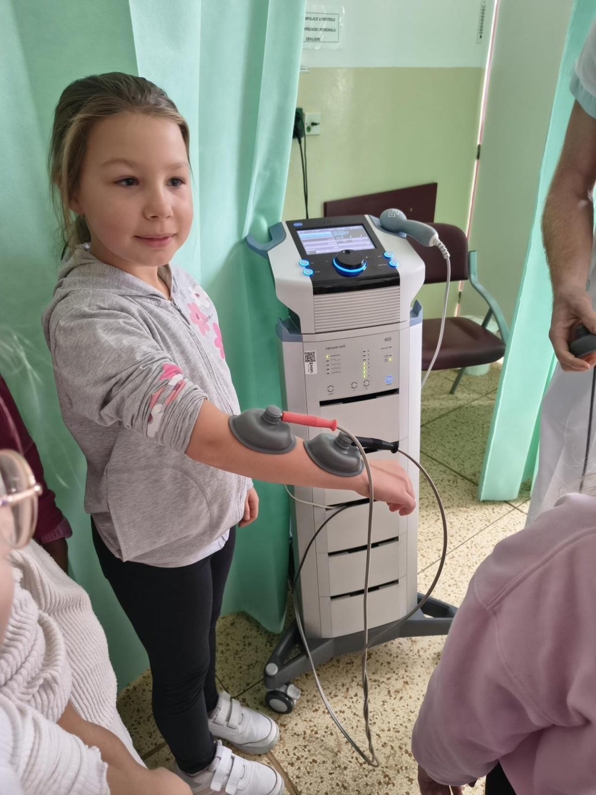 Navštívili jsme rehabilitační oddělení v nemocnici, kam nás pozval tatínek Emči. Bylo to pro nás velmi zajímavé. Viděli jsme, jak se léčí pacienti vodoléčbou, elektroléčbou nebo laserem nebo rázovou vlnou. Ti odvážní si to i vyzkoušeli. Co jsme si vyzkoušeli všichni, byl pás, po kterém jsme se učili správně chodit. No, někteří po něm spíš běhali, asi někam spěchali... :-)