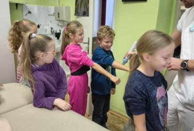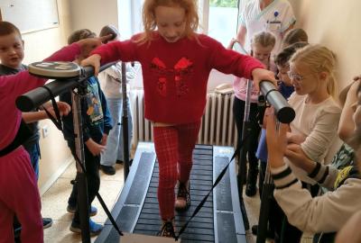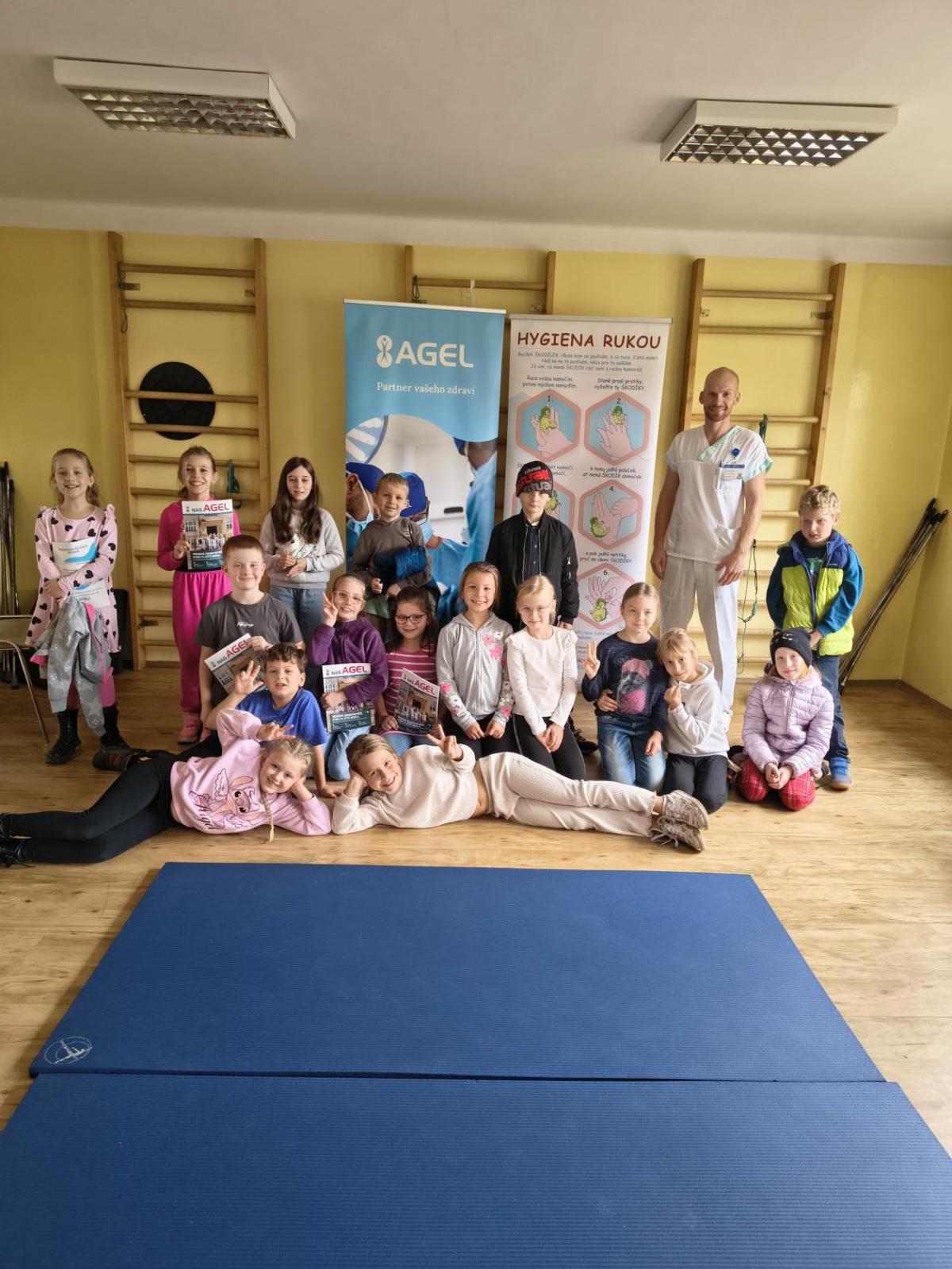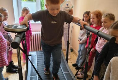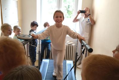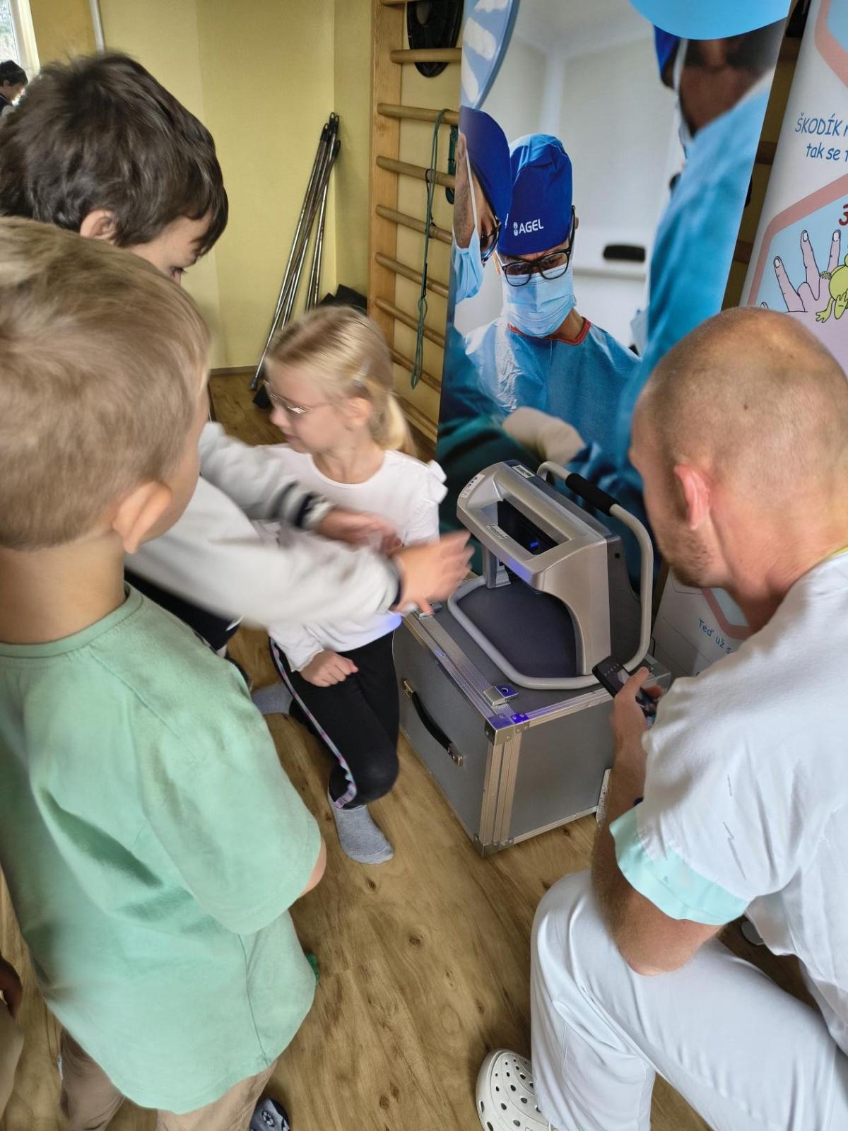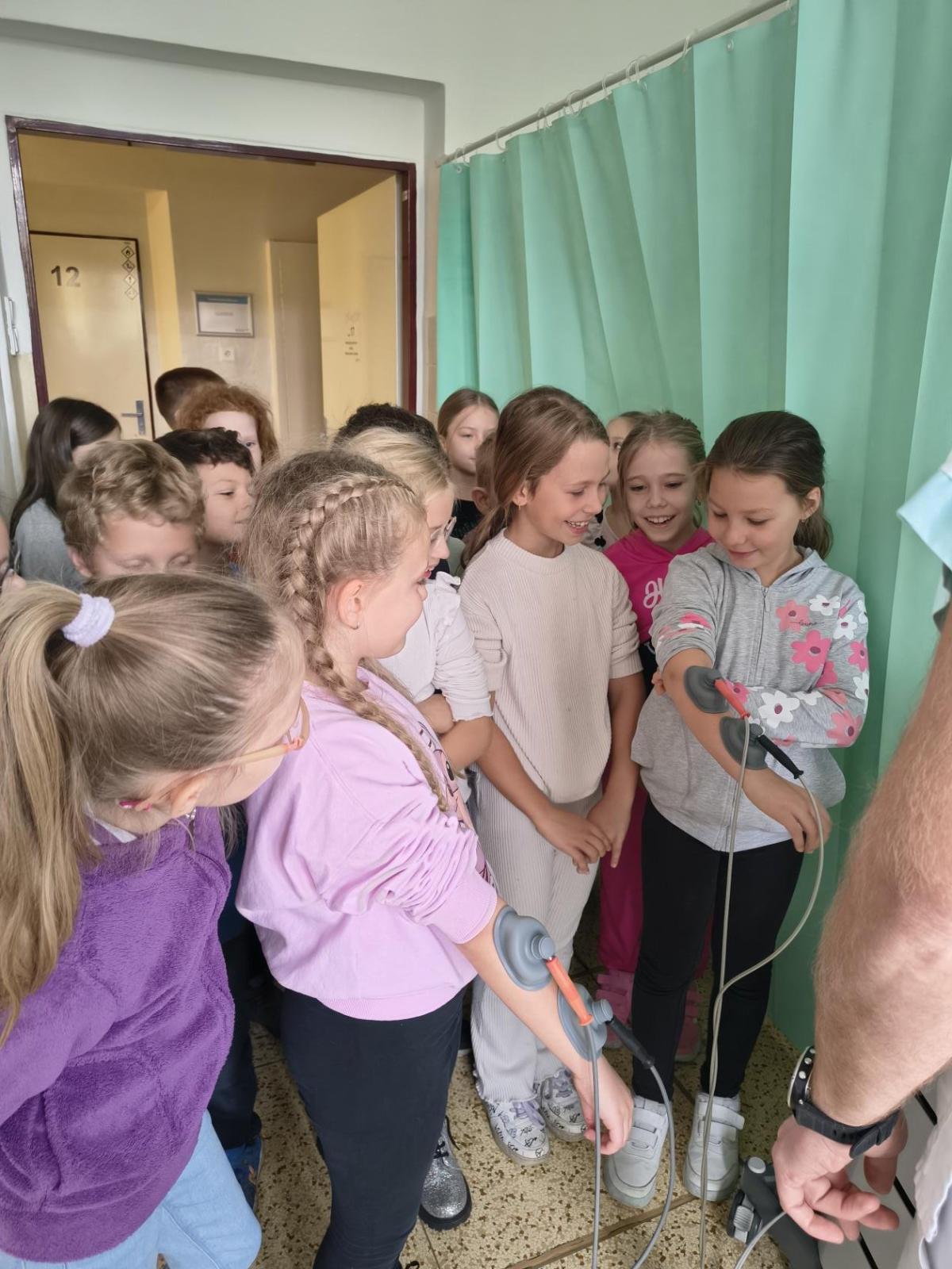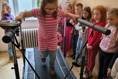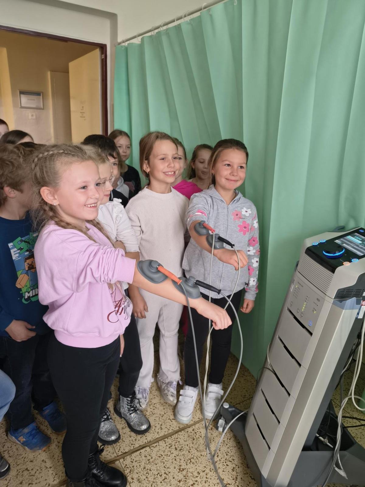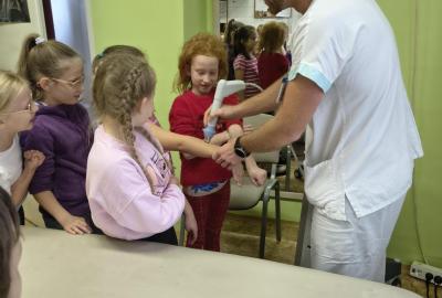 Navštívili jsme rehabilitační oddělení v nemocnici, kam nás pozval tatínek Emči. Bylo to pro nás velmi zajímavé. Viděli jsme, jak se léčí pacienti vodoléčbou, elektroléčbou nebo laserem nebo rázovou vlnou. Ti odvážní si to i vyzkoušeli. Co jsme si vyzkoušeli všichni, byl pás, po kterém jsme se učili správně chodit. No, někteří po něm spíš běhali, asi někam spěchali... :-)